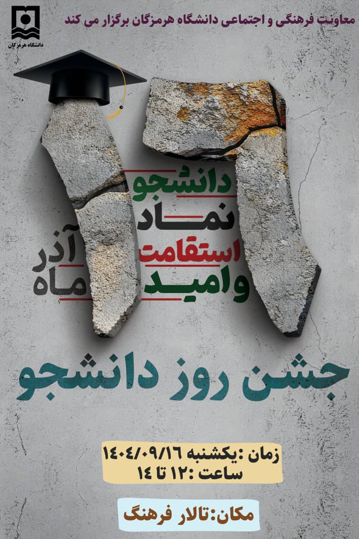 بدین وسیله به اطلاع دانشجویان عزیز می‌رسانیم که معاونت فرهنگی و اجتماعی دانشگاه هرمزگان به مناسبت گرامیداشت مقام والای دانشجو، برنامه‌ای ویژه و شاد را تدارک دیده است. این جشن روز یکشنبه 16 آذر، از ساعت 12 تا 14 در تالار فرهنگ برگزار می‌شود و فرصتی بی‌نظیر برای همراهی با هم‌دانشجویان، تجربه لحظاتی انگیزشی و بزرگداشت تلاش‌های علمی شماست.