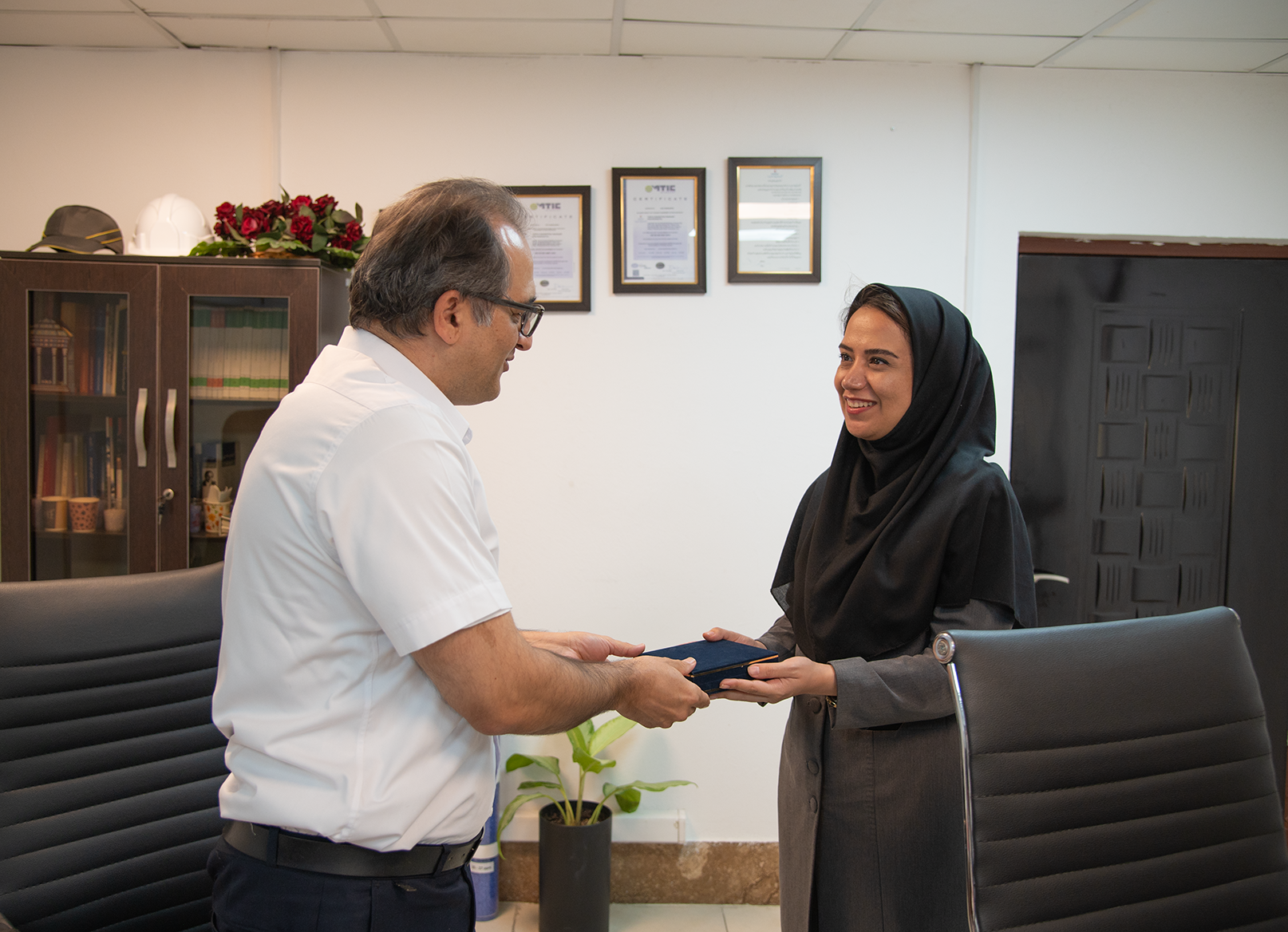 در بخش دیگری از این بازدید، سرکار خانم دکتر عظیمی و جناب آقای دکتر رحیم‌نیا، از اعضای هیات علمی دانشگاه هرمزگان، با حضور مدیر سایت پتروشیمی دیدار و تندیس یادبودی از سوی دانشگاه اهدا کردند. در این دیدار، پیشنهادهایی در زمینه گسترش همکاری‌های علمی، آموزشی و پژوهشی مطرح شد که با حمایت کامل مسئولان شرکت همراه بود. همچنین آمادگی مجموعه پتروشیمی برای پشتیبانی از آزمایشگاه‌ها و فعالیت‌های آموزشی دانشگاه، از جمله تأمین برخی مواد اولیه مورد نیاز، اعلام شد که گامی مؤثر در جهت تعمیق همکاری‌های دوجانبه دانشگاه و صنعت به شمار می‌رود.
