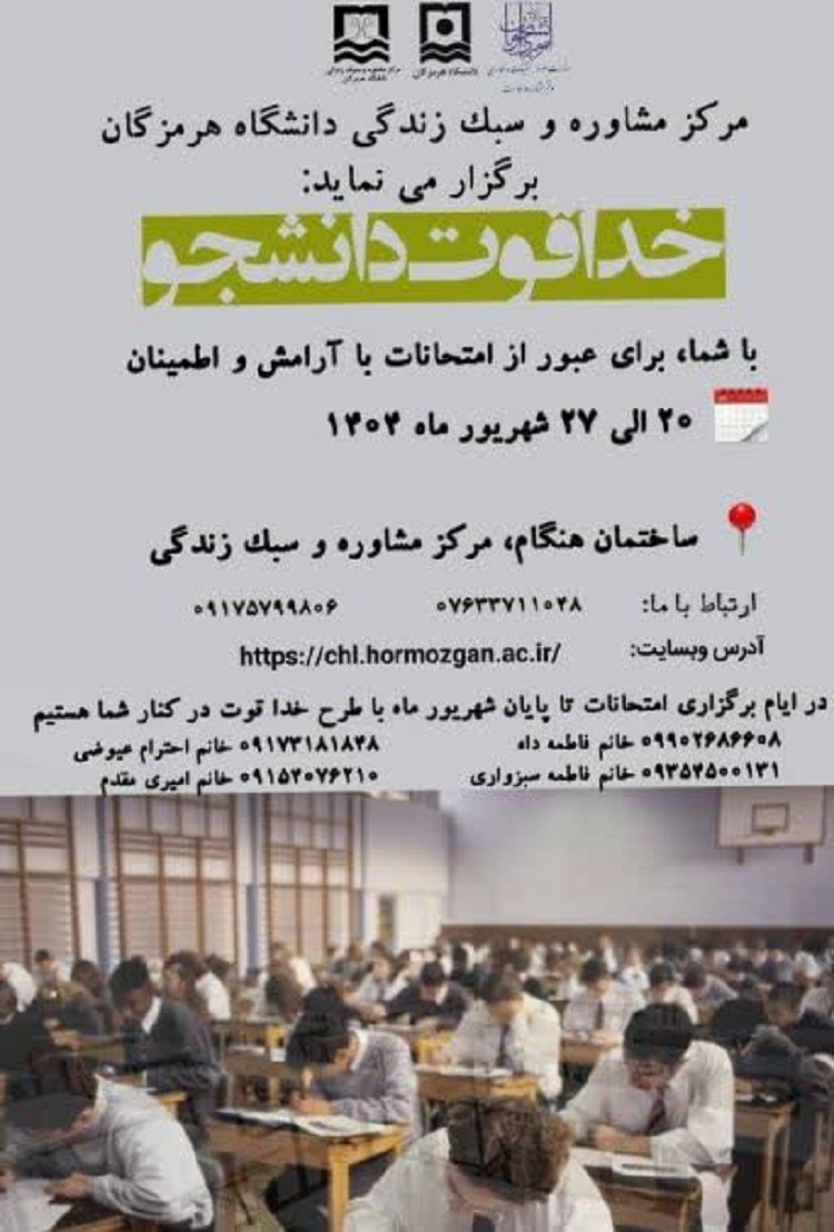 اجراي طرح [خدا قوت ] در دانشگاه هرمزگان با حضور كارشناسان مركز مشاوره و سلامت: اهداف طرح «خدا قوت دانشجویی»: افزایش آگاهی دانشجویان درباره روش‌های موثر آماده‌سازی برای امتحانات، مدیریت و کنترل استرس و اضطراب مرتبط با آزمون‌ها ارتقاء مهارت‌های خودمراقبتی، آموزش اصول تغذیه سالم در ایام امتحانات، ارائه نکات کاربردی و راهکارهای علمی برای حفظ سلامت جسمی و روانی در زمان امتحانات، کمک به دانشجویان برای شرکت در آزمون‌ها با آمادگی کامل و آرامش خاطر،
