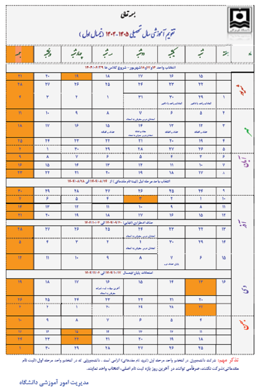 تقویم آموزشی سال تحصیلی 1405-1404 (نیمسال اول )