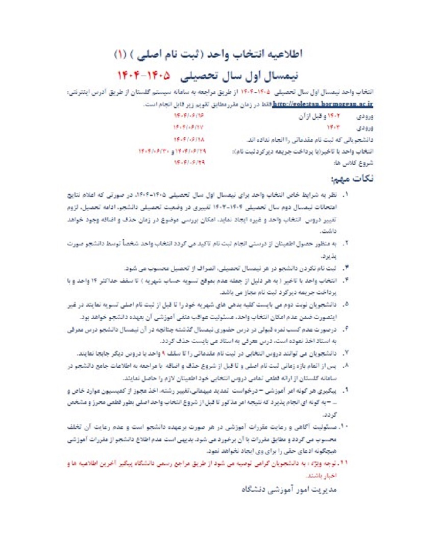 اطلاعیه انتخاب واحد مرحله اول (ثبت نام مقدماتی )نیمسال اول 1405-1404