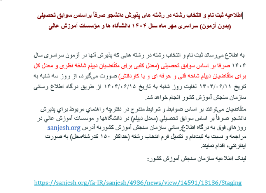 اطلاعیه ثبت نام و انتخاب رشته در رشته های پذیرش دانشجو صرفاً براساس سوابق تحصیلی (بدون آزمون) سراسری مهر ماه سال 1404 دانشگاه ها و موسسات آموزش عالی